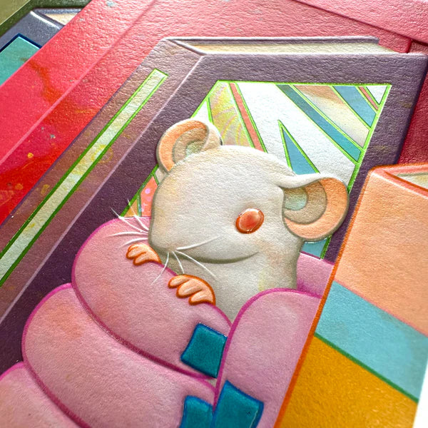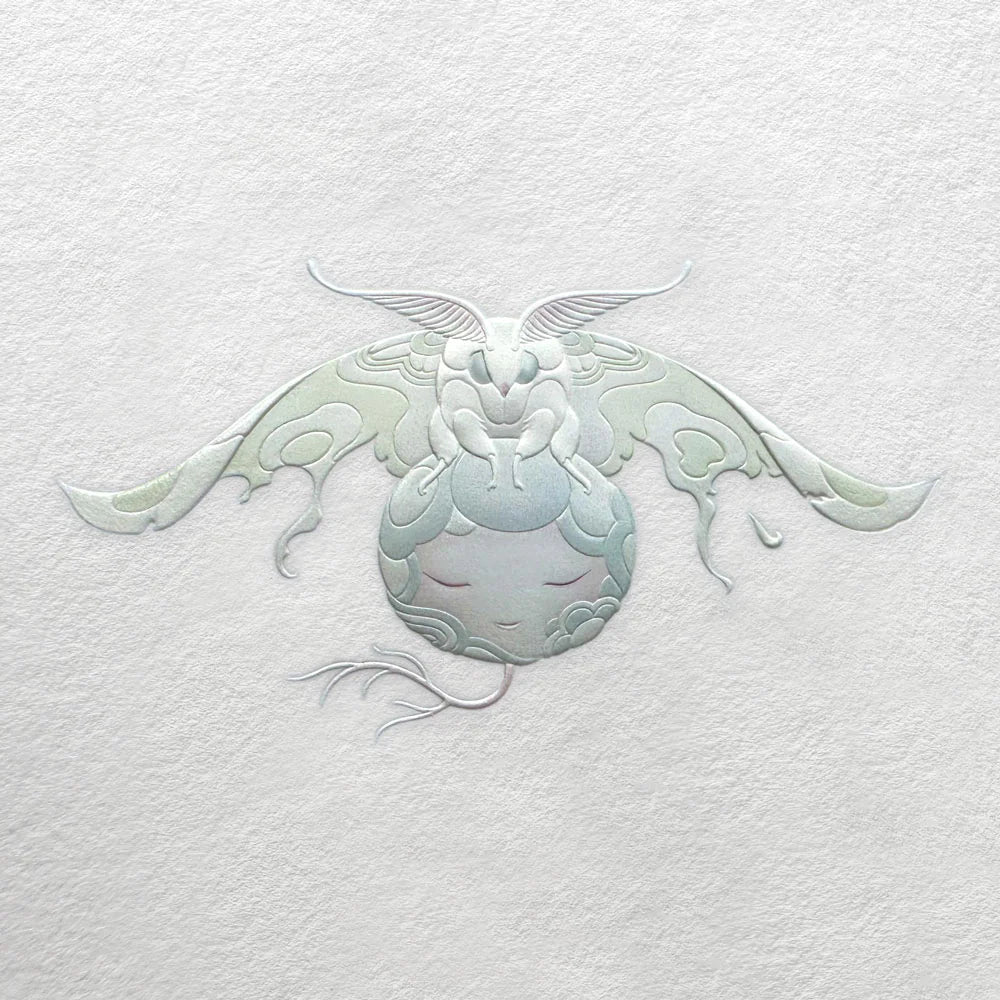 Mulitprocess prints with Intricate foil detailing Sculptural glass-like details and enhancements